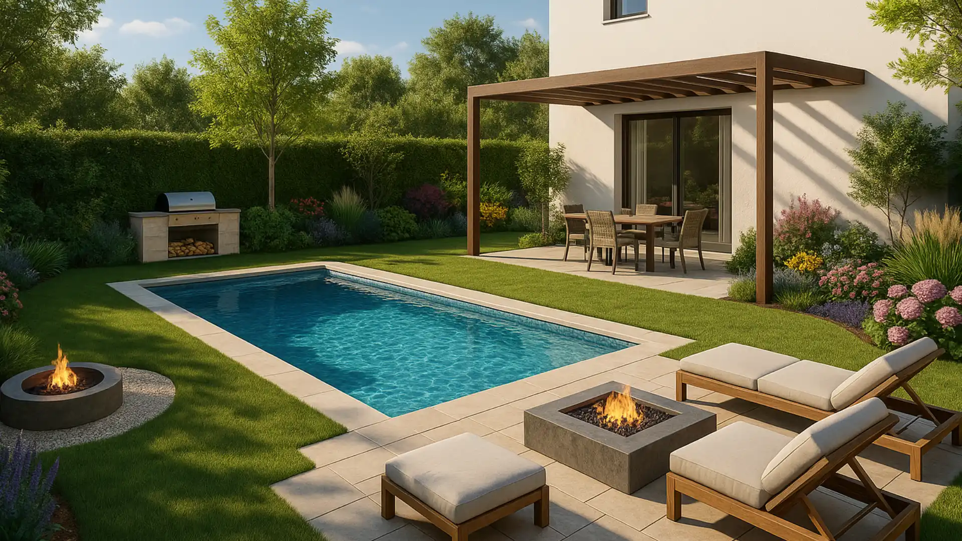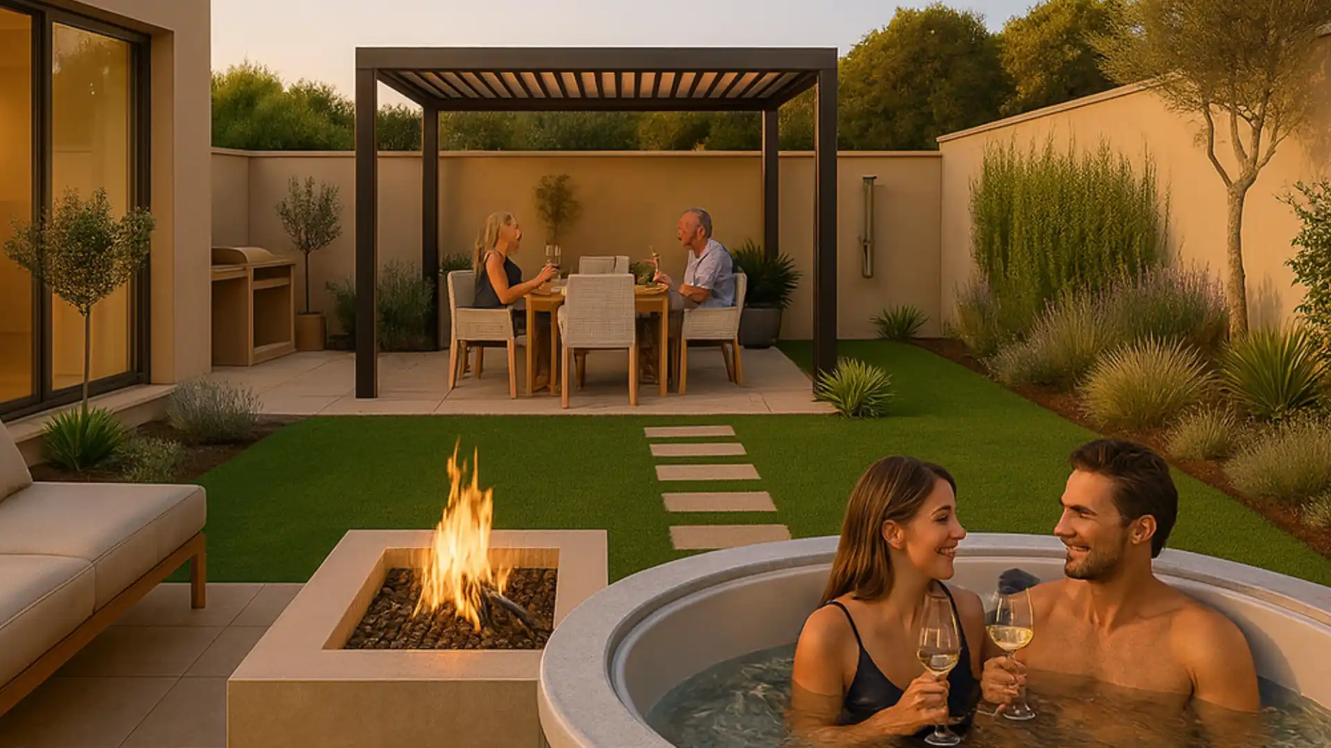 - przestrzeń z jacuzzi, prysznicem lub kuchnią zewnętrzną,