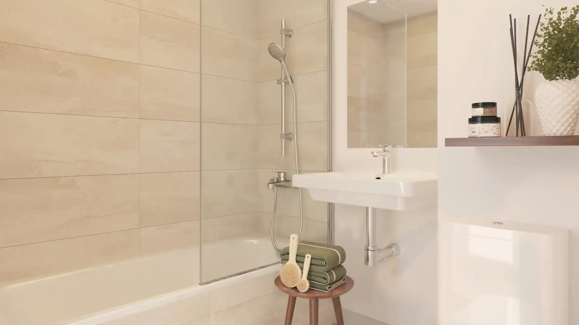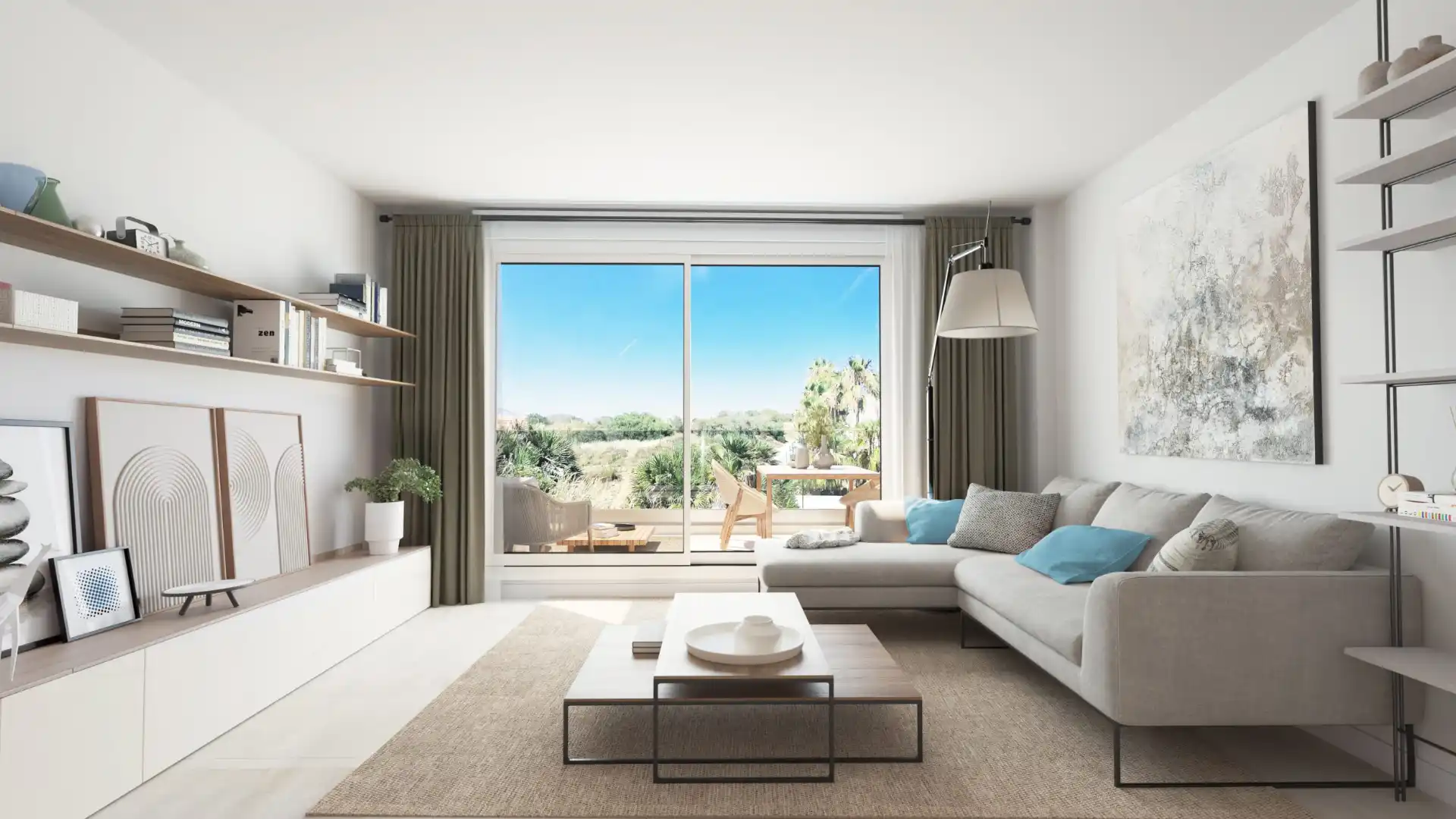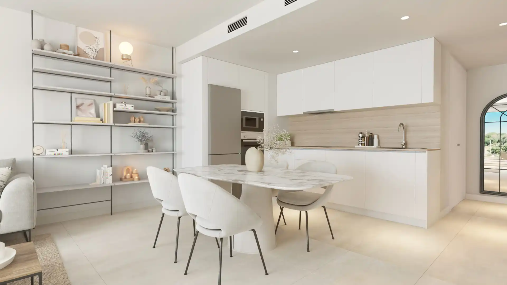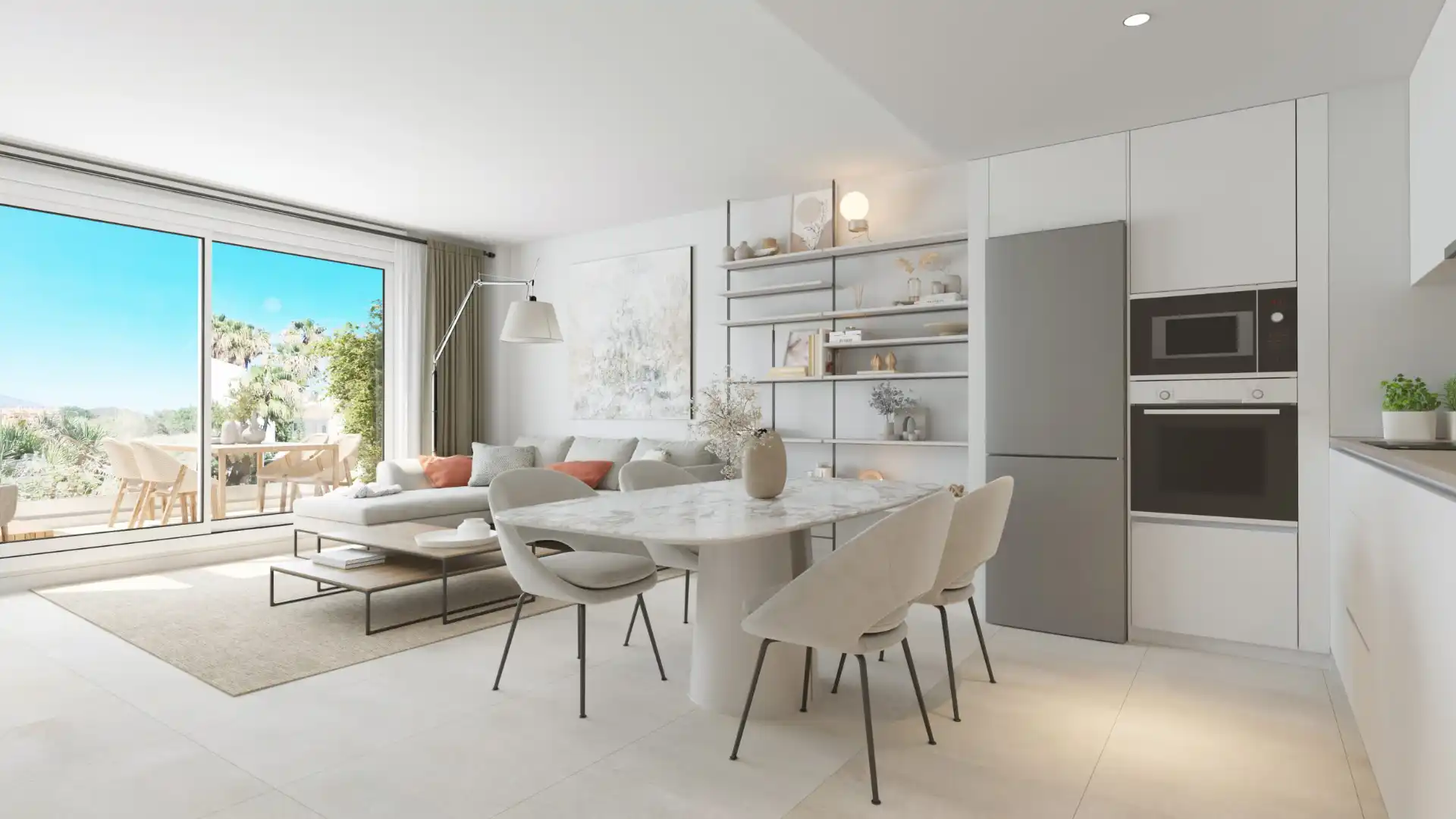 Naturalne światło, neutralna kolorystyka i wysokiej jakości materiały tworzą harmonijną, elegancką przestrzeń do życia.