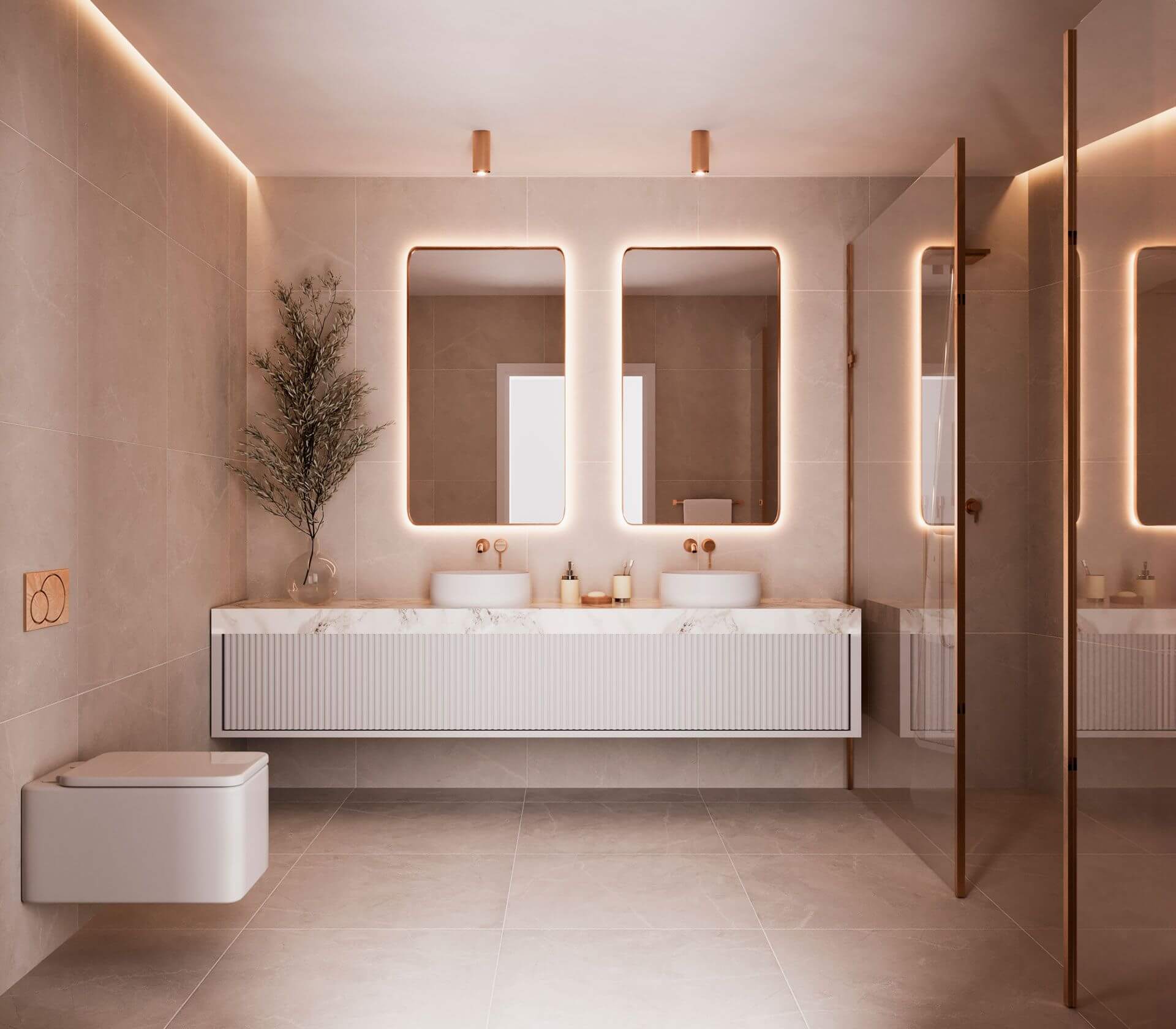 - Wysokiej klasy materiały: naturalny kamień, drewno, ceramika Porcelanosa